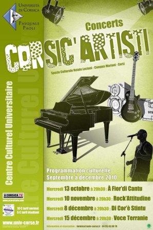 Musique Di Cor’è Stintu avec I Chjami Aghjalesi Première partie : Vogulera Mercredi 8 décembre à 20h30 À l’occasion d’A Festa di a Nazione Spaziu Culturale Natale Luciani – Campus Mariani Incontestablement, Chjami Aghjalesi compte parmi les groupes phares de la chanson Corse. Entre tradition et modernité, cette formation artistique fondée en 1977 prend ses racines dans le quartier San Ghjiseppu de Bastia et a su rayonner à travers toute l’île et bien au-delà, avec des centaines de concerts épiques aux quatre coins du monde. Leur premier 33 tours « Nant’à u solcu di a Storia » est publié en 1979. « Celui-ci témoigne d’une véritable volonté des artistes de perpétuer la mémoire et les traditions du peuple Corse, tout en participant au mouvement de renaissance culturelle engagé depuis le début des années 1970 par le groupe Canta U Populu Corsu ». En l’espace de onze albums et d’un DVD paru à l’occasion des 30 ans du groupe, les « Chjami » –comme on les appelle plus communément– ont composé une œuvre originale, mâtinée d’influences méditerranéennes, sud-américaines et slaves. Ces talentueux chanteurs et musiciens sont également de fins adeptes et d’authentiques ambassadeurs de la polyphonie dont ils parsèment subtilement chacun de leur opus ; « Cantu Sacru » (1991) est une référence en la matière. En septembre 2010, la sortie dans les bacs –tant attendue– du nouvel album « Sventulerà » enchantera le public insulaire avec un univers de création identitaire et universel, fidèle à l’esprit Chjami Aghjalesi. Fin octobre de la même année, le groupe accueillera à Bastia et Ajaccio la tournée mondiale les Chœurs de l’Armée Rouge pour quatre représentations inédites. http://www.chjami-aghjalesi.com/ Voce Terranie avec Alba Première partie : Sperenza Mercredi 15 décembre à 20h30 Spaziu Culturale Natale Luciani – Campus Mariani Sept musiciens composent le groupe Alba. Ce groupe, né en 1992, hérite, comme tant d’autres, de la fibre culturelle et identitaire, réhabilitée par les années du « Riacquistu ». En 1999, premier album « I soli ciuttati ». De plaisir partagé, la musique et le chant se font expression. En 2006, ils enregistrent leur second album (live), aboutissement de quatre années de travail, de recherche, de progression vocale et instrumentale. Trois ans après, un nouveau cap est franchi avec la sortie du troisième album du groupe Alba. Une instrumentation toujours plus subtile, des textes aux envolées lyriques et divines, dont certains écrits par Dominique Colonna et Santu Massiani, des voix qui nous transportent ailleurs, tout en nous replongeant au cœur des terres de Balagne. Benjamin Dolignon (Terza), Ceccè Guironnet (Clarinette), Cédric Savelli (Guitare, violon et multiples instruments à cordes), Éric Ferrari (Basse), Jean-François Vega (Guitare et chant) et Sébastien Lafarge (Voix principale) construisent la tradition comme la tradition les construit. Ils aiment à dire que leur tradition n’est pas figée, mais au contraire vivante, en évolution, en mouvement. Les sonorités, puisées aux sources d’influences méditerranéennes, surprennent et interpellent. Acoustique, sans surcharge, tout en finesse, leur musique a grandi. Elle est totalement atypique dans l’univers musical insulaire. Derrière les accords, derrière l’harmonie, on sent l’évolution du groupe. Chaque note est pesée, calculée, travaillée. L’initié entend ce travail et l’apprécie, le profane, lui, se laisse simplement porter par l’alchimie des sons. http://www.l-alba.com/